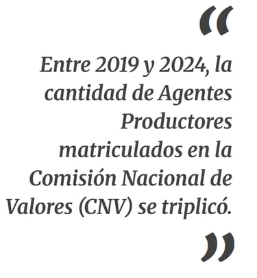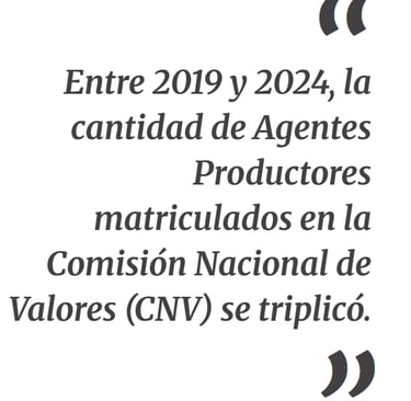 Es en este nuevo contexto donde el asesor financiero independiente ha comenzado a desempeñar un rol relevante. Entre 2019 y 2024, la cantidad de Agentes Productores matriculados en la Comisión Nacional de Valores (CNV) se triplicó, mientras que la cantidad de otros agentes se mantuvo estable. Este crecimiento sin precedentes es un reflejo de la creciente demanda de una asesoría más cercana y personalizada.