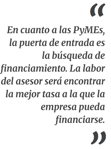 En cuanto a las PyMEs, la puerta de entrada es la búsqueda de financiamiento. La labor del asesor será encontrar la mejor tasa a la que la empresa pueda financiarse. Para ello resulta clave contar con una cuenta comitente, que permita comparar las tasas disponibles en el mercado con las ofrecidas por los bancos. Existen segmentos dentro del mercado que se adaptan a las diferentes situaciones crediticias de las PyMEs para operar cheques de pagos diferidos, facturas de crédito electrónica o pagarés.
